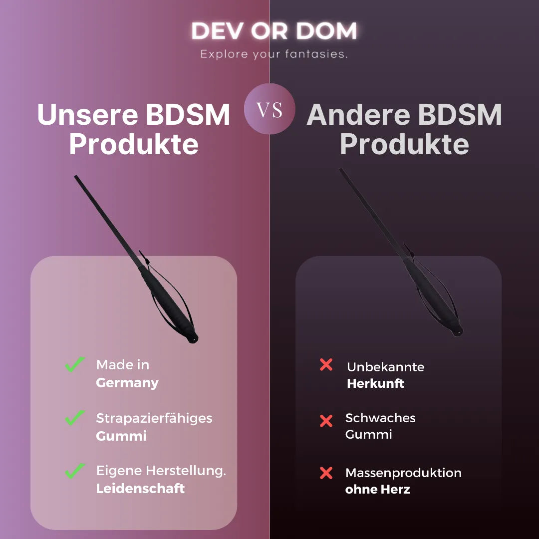 Der Kohlefaser Cane Stick, leicht flexibel, hat es wirklich in sich. Er hinterlässt einen länger anhaltenden Schmerz. Für das bessere Handling ist eine kleine Handschlaufe aus Wildleder.