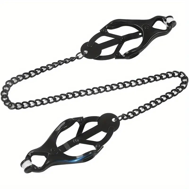 Diese schönen Nippelklemmen geben Deinem Rollenspiel eine extra Prise Sinnlichkeit. Die Klemmen sind im Retro-Design aus glänzendem schwarzem Metall gefertigt. Durch eine Verbindungskette sind beide Klemmen miteinander verbunden. Die Klemmen sind auf der Innenseite gummiert.